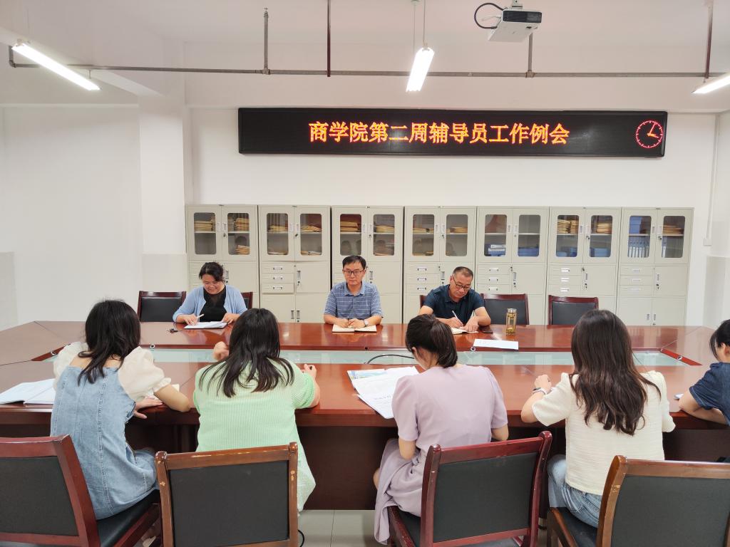 9月11日下午,商学院在实训楼B507会议室召开第二周辅导员工作例会。商学院党委书记肖良,副院长宁青青和全体辅导员参加了会议,党委副书记周亚主持会议。