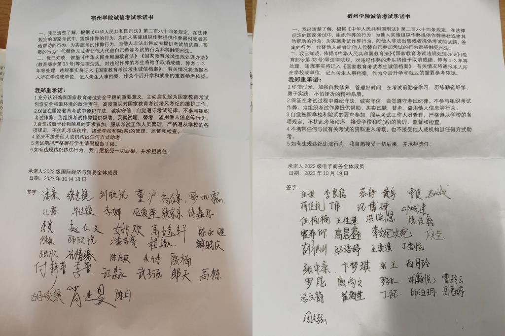同时,各班通过主题班会、主题团日等各种形式陆续开展倡议活动,各班传达了学校《关于加强成人高考、自学考试和研究生考试等国家教育考试期间学生管理的通知》精神,学习了《中华人民共和国教育法》和《国家教育考试违规处理办法》等有关文件,告诫广大学生要深刻认识到违法行为带来的后果,引导自觉抵制违纪作弊行为。