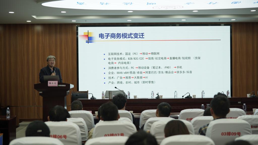 会上,周忠宝教授做了题为“区块链视角下的供应链可靠性与透明度”的大会报告,通过基于消费者透明度意识的研究,考虑是否采用区块链技术的两种场景下得到的价格和透明度均衡决策。分析了供应商采用区块链技术的条件,并给出了管理层面的见解,最后,在扩展部分考虑双渠道场景,探讨了供应商开通直销渠道的条件。张李义教授做了题为“电子商务发展生态与创新创业竞赛”的大会报告,通过对电子商务模式变迁的深入研究,引出了对“新电商”、“数字商务”的思考,并介绍了我国电子商务的发展趋势及挑战。然后,通过对全国大学生电子商务“创新、创意及创业”挑战赛的介绍,激发参会学生参赛的积极性。倪明教授做了题为“大学生四种能力的培养”的大会报告,通过一个故事生动的引出了当代大学生所需要具备的专业技术能力、无师自通的自学能力、组织沟通协调交际能力和创新能力,并深入分析了大学生应如何培养这四种能力。陈阿兴教授做了题为“数字经济时代电商类专业建设与人才培养思考”的大会报告,从电子商务专业建设存在的问题、新时代电子商务专业如何发展、一流电子商务专业如何建设等方面对电子商务专业建设思路和发展趋势进行了分析。刘红军做了题为“农村电子商务专业人才培养改革与实践”的大会报告,通过培养理念改革、模式改革、教学方式改革,通过校地企协同育人,不断加强服务乡村振兴的高素质电子商务专业人才培养。商学院教师郭玉侠博士做了题为“数据驱动的数字经济对物流业碳排放效率影响研究”的大会报告,为推进数字经济赋能物流业绿色低碳转型高质量发展,将数字经济与物流业碳排放效率两个系统放入同一框架,从系统论视角去构建两系统测度框架与评价体系,从全局最优视角来开展系统性、整体性的研究,从而推进物流业低碳绿色转型发展的需要。