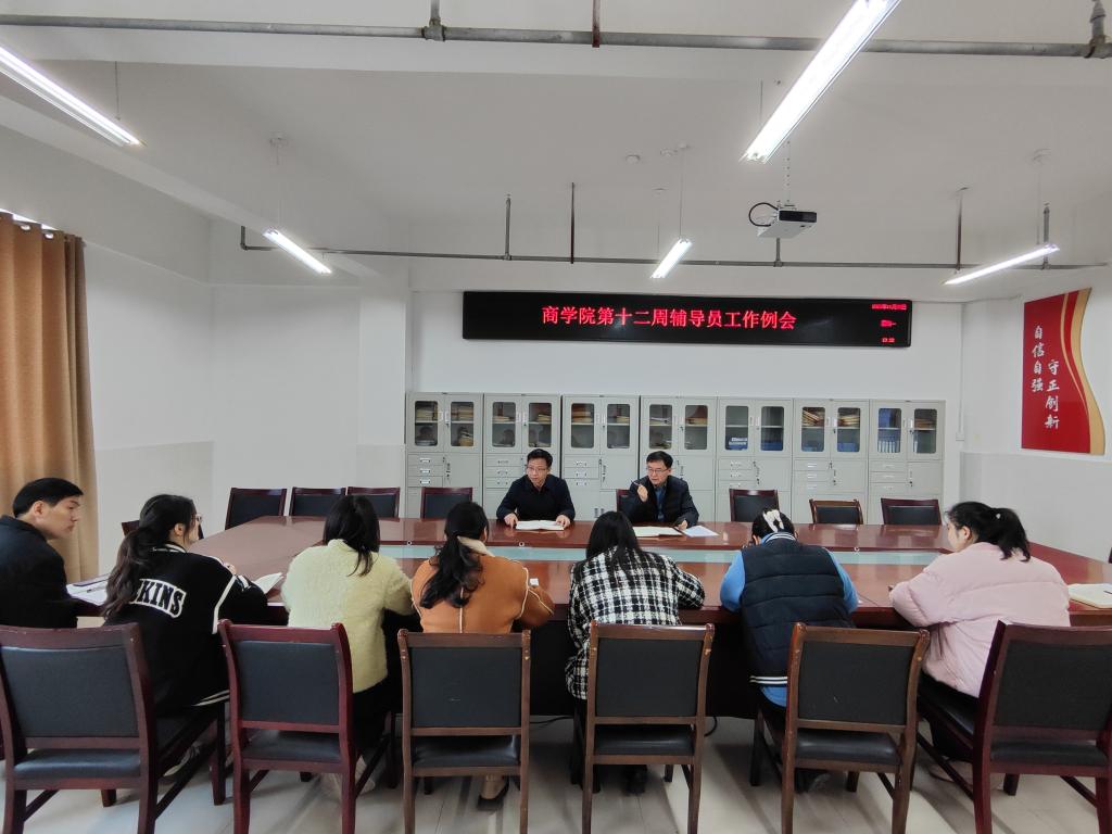 11月20日上午,商学院在实训楼B507会议室召开第十二周辅导员工作例会。商学院党委书记肖良,党委副书记、院长刘红军和全体辅导员参加了会议。