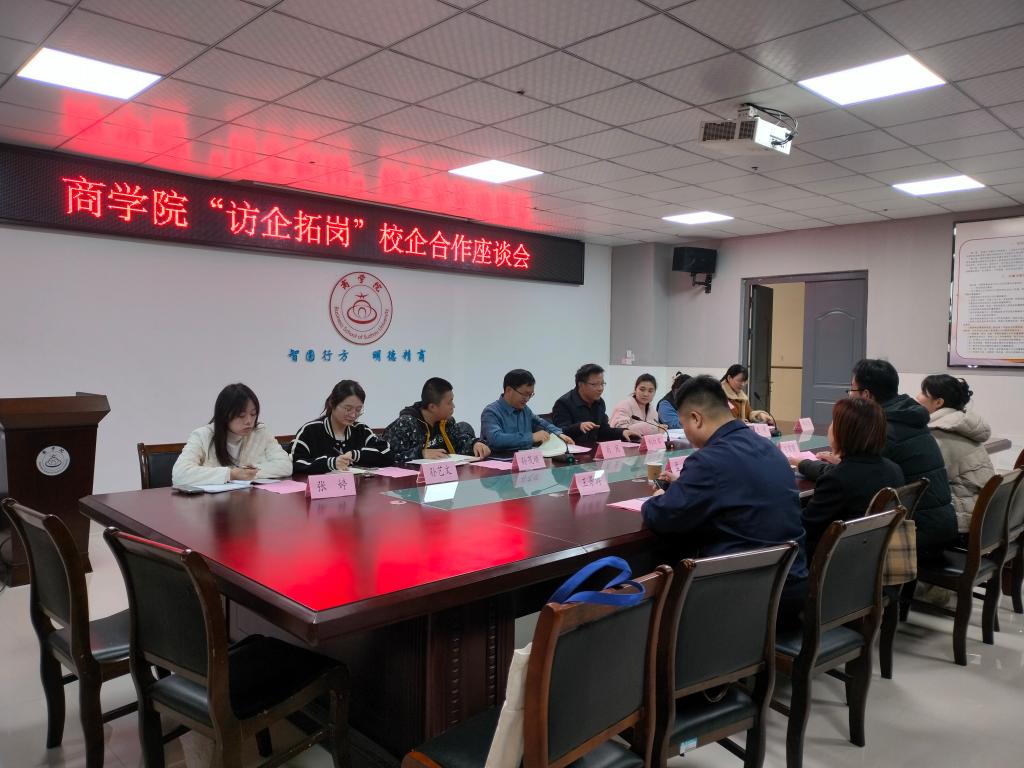 为进一步深化校企合作,助力毕业生充分高质量就业,11月20号下午,商学院在实训楼B517会议室召开“访企拓岗”校企合作座谈会。浙江澎渤电子商务有限公司、宿州云伙计电子商务有限公司、宿州市居然之家商业管理有限公司、安徽微必应信息科技有限公司四家企业来学院洽谈合作。商学院党委书记肖良,党委副书记、院长刘红军和全体毕业班辅导员参加了会议。