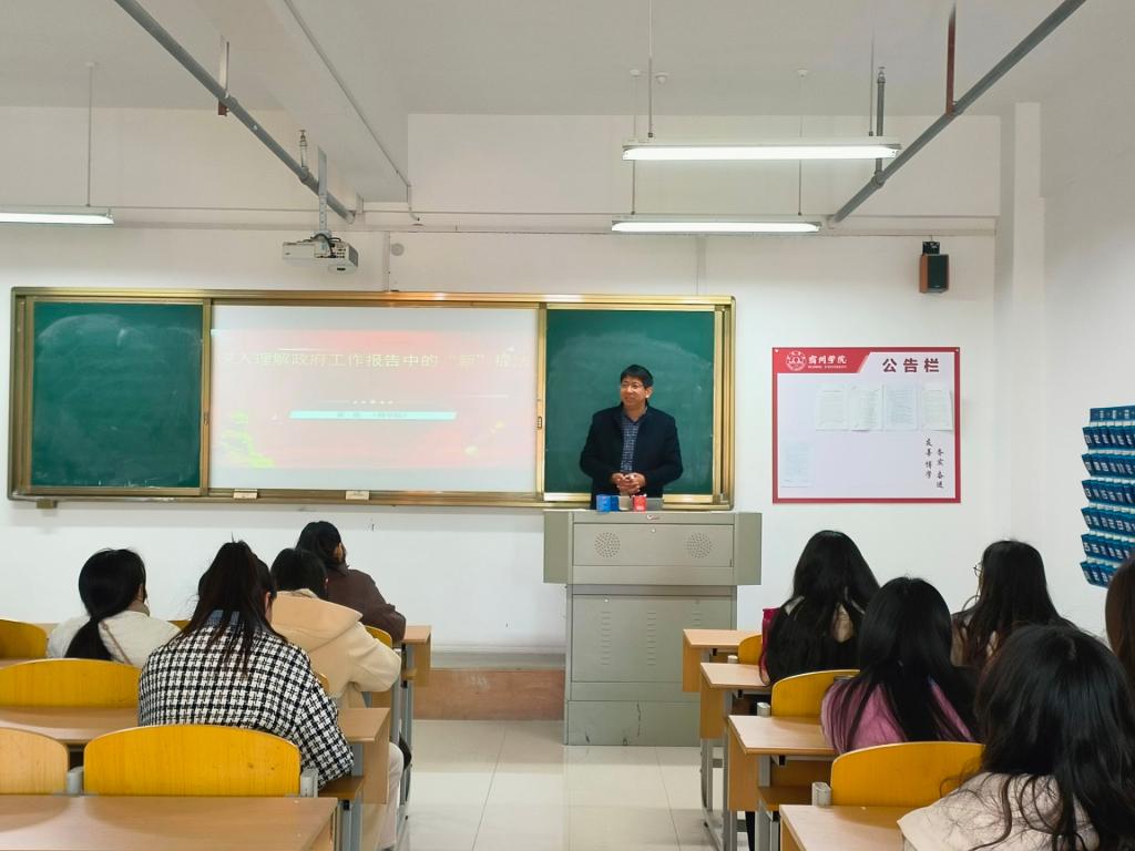 为深入学习贯彻全国两会会议精神,更好地理解政府工作报告, 2024年3月21日下午,商学院正处级组织员黄凯为商学院市场营销与物流专业学生党支部在实训楼B206讲授专题党课:《学习深入理解政府工作报告中的“新”提法》,本次党课由党支部书记刘文佳同志主持,支部全体党员参加。