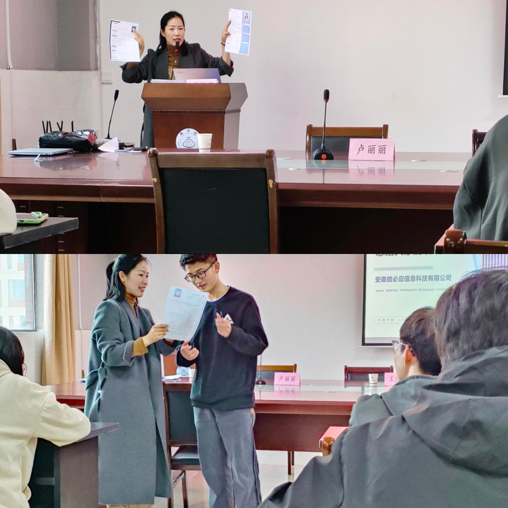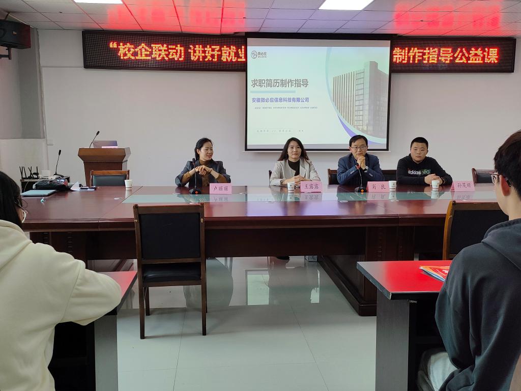 为提升大学生的就业综合能力和职业素养,进一步增强大学生就业意识,树立正确的就业观,4月9日下午,商学院在实训楼B517会议室举办了简历制作指导公益课活动。安徽微必应信息科技有限公司人力资源主管王露露和人事专员卢丽丽作主讲嘉宾,商学院党委书记肖良、学生事务管理科负责人和21级财务管理专业60余名学生参加了活动。