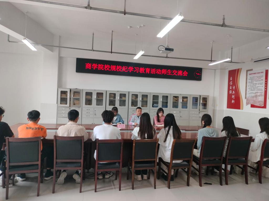 为创建良好的校风学风,构建和谐有序、积极向上的育人环境,5月7日上午,商学院在实训楼B507会议室召开校规校纪学习教育活动师生交流会。商学院学生事务管理科副科长孙茂顺,辅导员张婷,辅导员刘文佳和学生代表参加了交流会。