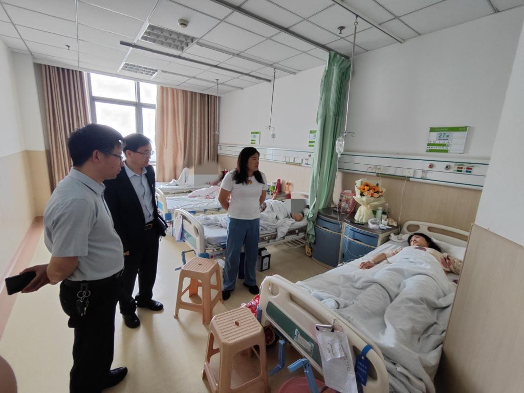 肖良和刘红军代表学院表达了对学生病情的高度关注,亲切询问目前的治疗进度及身体状况,鼓励学生保持良好心态,增强信心,安心养病,早日康复,并为学生送上慰问品。
