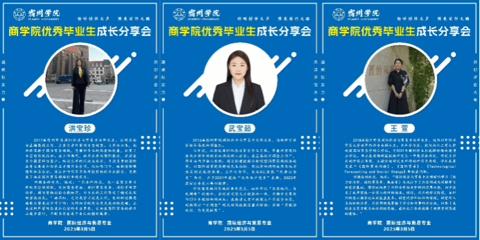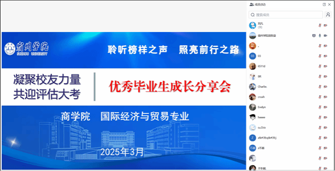 为落实立德树人根本任务,提升人才培养目标的达成度、社会需求的适应度、学生和用人单位的满意度,2025年3月5日晚7点,商学院电商与国贸教研室举办优秀毕业生成长分享会,邀请了三名优秀毕业生开展线上成长经验分享。商学院国际经济与贸易专业师生参加了此次线上分享会。