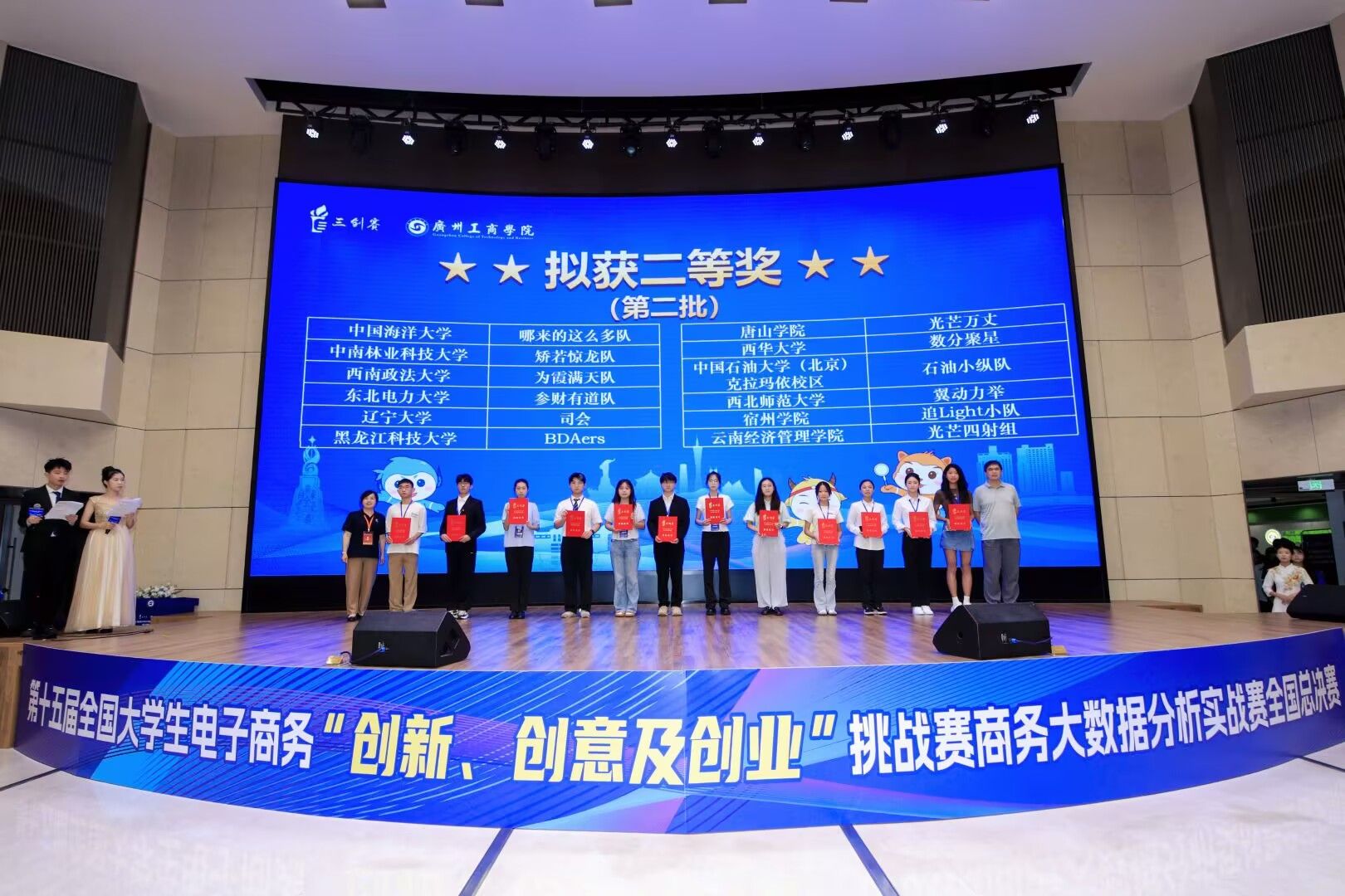 第十五届全国大学生电子商务“创新、创意及创业”挑战赛商务大数据分析实战赛全国共计1064所高校、10395支团队、超过5万名师生报名参赛,历经校赛和省赛,最终有来自99所院校的117支队伍进入全国总决赛。我校商学院“追Light小队”团队比赛过程中围绕真实企业数据,构建了从数据清洗、建模、可视化到商业决策建议的完整解决方案,演讲和答辩环节赢得现场评委一致好评,最终荣获全国二等奖。