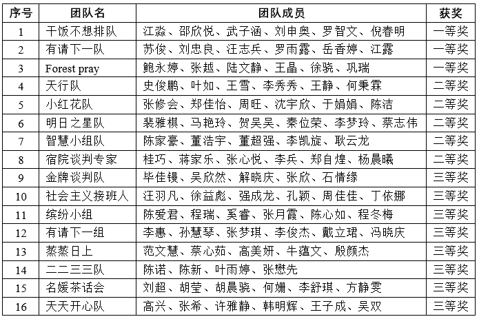 根据我校《关于组织参加“2022 年安徽省大学生国际商务模拟谈判大赛”校园赛通知》文件精神,教务处和商学院积极开展了大赛的组织和评选工作,并顺利完成大赛的奖项评选工作。本着公平、公正和公开的原则,现将竞赛结果进行公示(相同获奖等级内排名不分先后),公示日期为12月1日—12月5日,如有异议,请向教务处书面反映。
