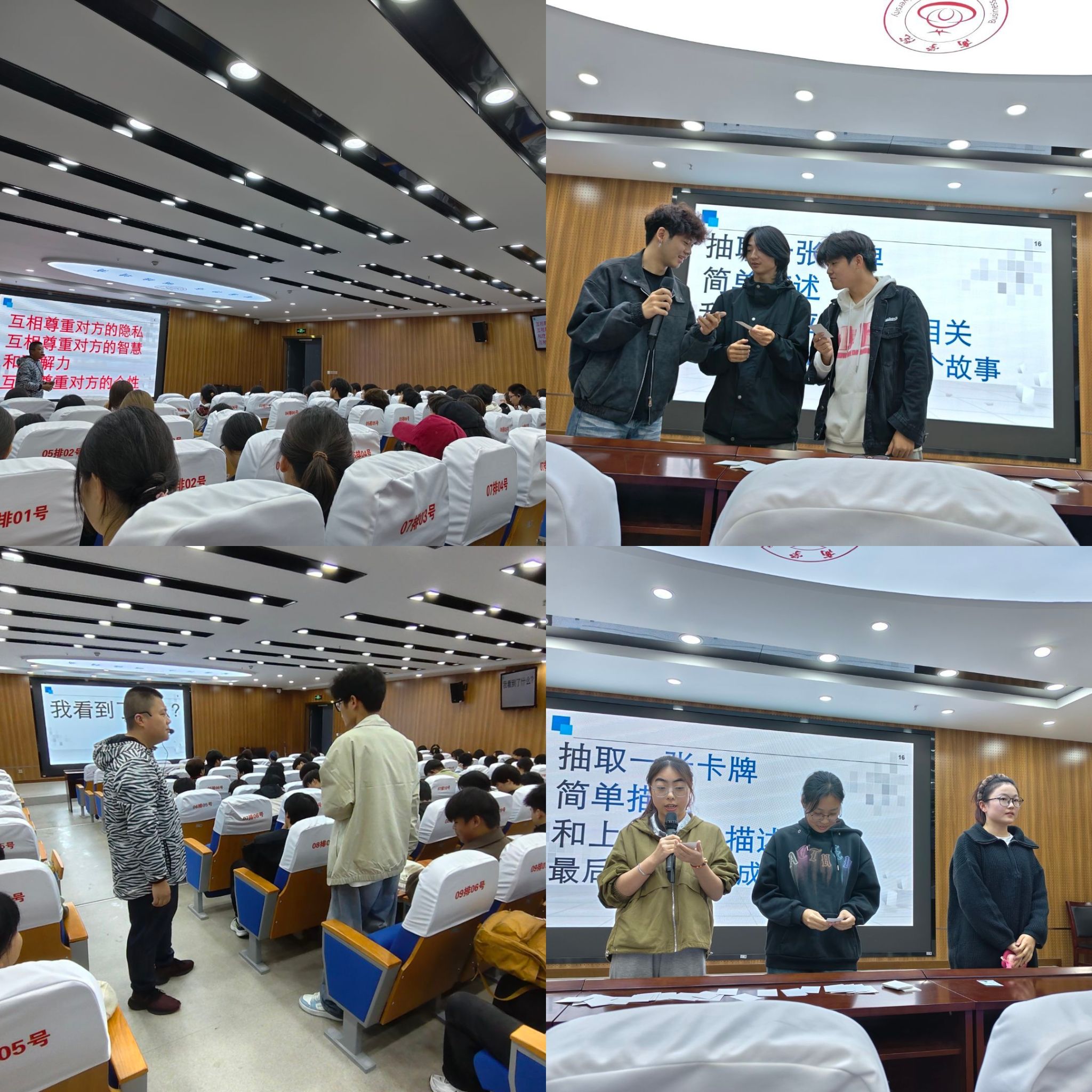 OH卡牌也被称为“潜意识投射卡”,它像一面心灵的镜子,能够帮助使用者探索内在的情绪与思维。活动在充满新奇与期待的OH卡牌体验中展开。在“故事接龙”环节,同学们随机抽取图卡,并根据卡牌上的图像展开联想,共同编织一个天马行空又意味深长的集体故事。在“卡牌心声”环节,每位同学围绕抽取的卡牌进行小组分享,既有初入大学的迷茫,又有对精彩绚烂大学生活的愿景。借助卡牌这一安全而中立的媒介,同学们卸下心防,真诚交流,实现了深度的情感连接。现场惊叹声与欢笑声此起彼伏。